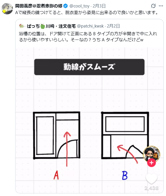 Xにて、ユニットバスの浴槽位置 AかBでBタイプが良い!って話になってるとかでバズってたので、私もリプ付けてみたけどw