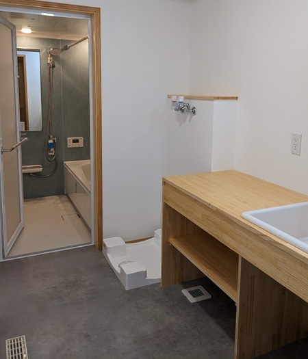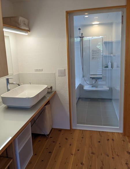 Aタイプで縦長ミラー設けると、脱衣室から姿見に出来ます。