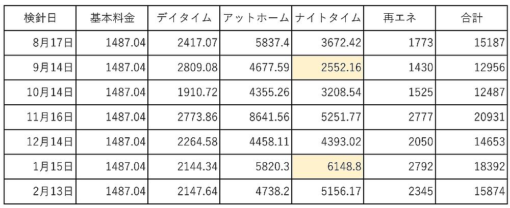 ナイトタイムに注目すると9月検針が一番安く、1月検針が一番高い事が分かります。
