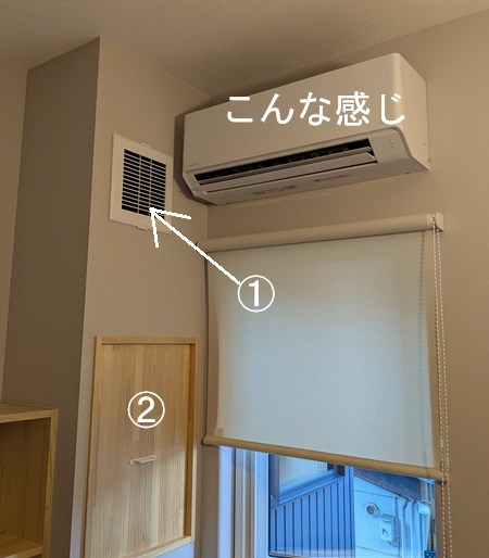 エアコンから出た冷気を②の中にある整流ファンで①のグリルから引っ張ります。