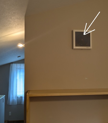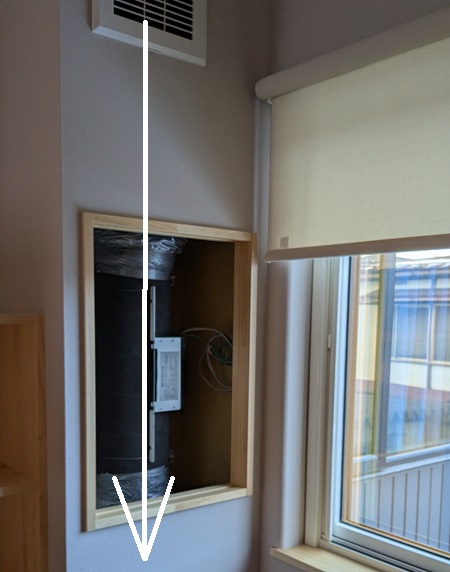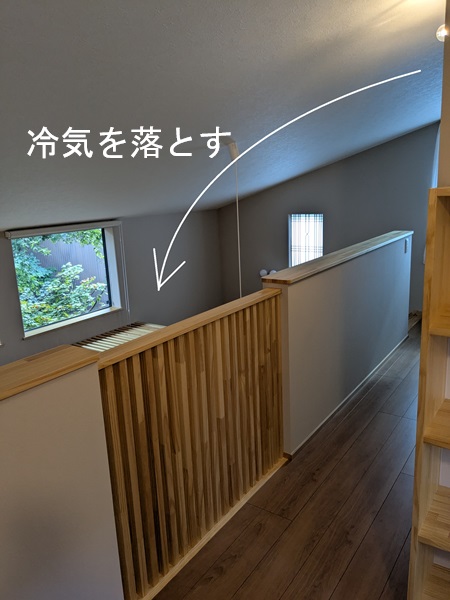 吹き抜けで繋がってるブロックは、このファンが無くても冷気が落ちますが、こちらの場合ブロックを外した寝室や、お風呂の暖気が来る脱衣室へ直接冷気(乾燥空気)を送るようにしてるんですね。