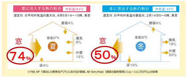 家の中に熱が出入りするのは「窓」からが大半で、冬は50%、夏はなんと74%もの熱が窓を通じて行き来している。