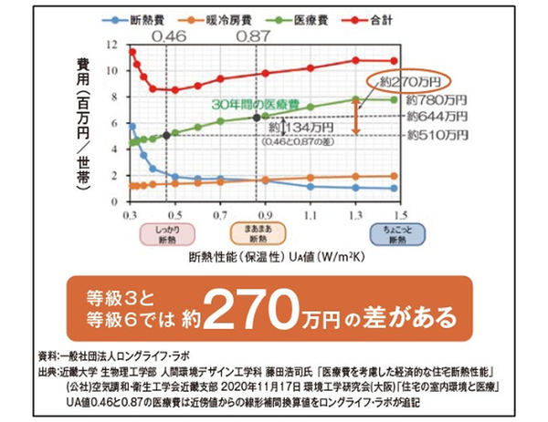 ◆断熱の等級によって、世帯当たり医療費は「270万円」の差がつくことも!?