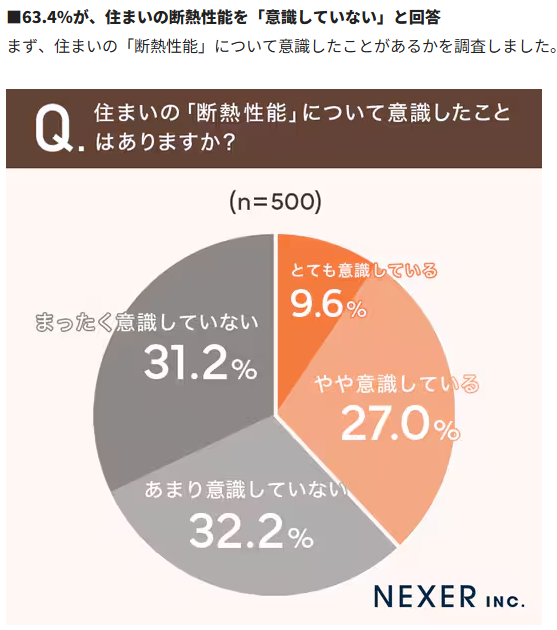 NEXER株式会社が実施したアンケート調査によると、回答者の63.4%が住まいの断熱性能を「意識していない」と回答しました。
