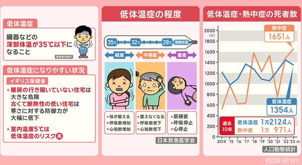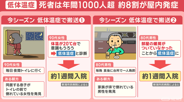 ヒートショックによる死者数は年間17000人声越えなんてデータがあるけど、低体温症で亡くなる方も1000人を超えているらしい。