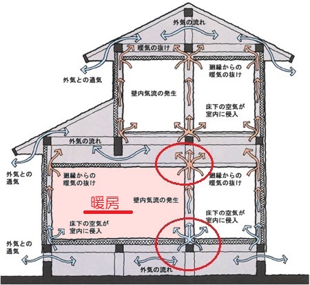 居間やキッチンなど暖房すればするほど、床下の冷たい空気を引き上げ、小屋裏に暖気を上げる煙突効果を生んでいます。