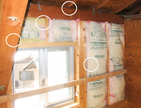 垂木の煽り止めがあったり無かったり、防湿層が無かったり、そもそも断熱材の入れ方がダメダメだったり、何の為か分からないナナメ材があったりで(笑