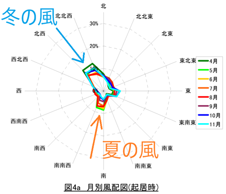 これ、地域によって地形や周囲の環境に大きく依存した、卓越風(たくえつふう)と言う高い頻度で吹く風向があります。