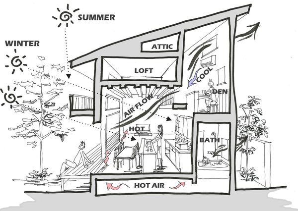 風を取り込むには風上に向かって「縦辷り出し窓」で風を取り込んだり、重力換気(高低差)として、上下階で風を動かすことも上級手段。