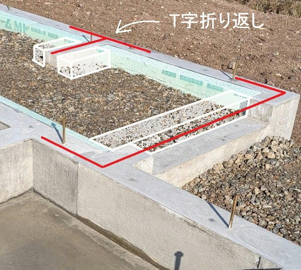 あと、T字部分もこんな感じで内側に伸ばしておかないとコンクリートが熱橋になります。