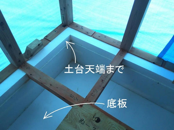 更に「土台部分」が熱橋にならない様、土台天端まで断熱施工してから床を施工します。