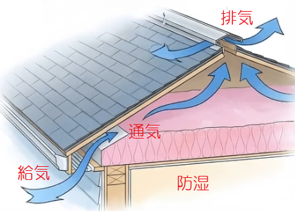 その上で屋根裏換気(ブルーの矢印)として軒下から新鮮な空気を取り込み、屋根の頂点(棟換気)から逃がす空気の通り道を作ります。