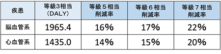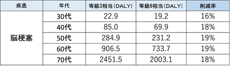 そんな等級3ですが等級6との比較で、DALY削減率を年齢層ごとに比較すると、例えば脳梗塞では、30歳代の16%に対して、50歳代・60歳代では19%と高い結果となり、高齢層ほど健康損失期間の削減効果が大きくなる傾向が見られています。