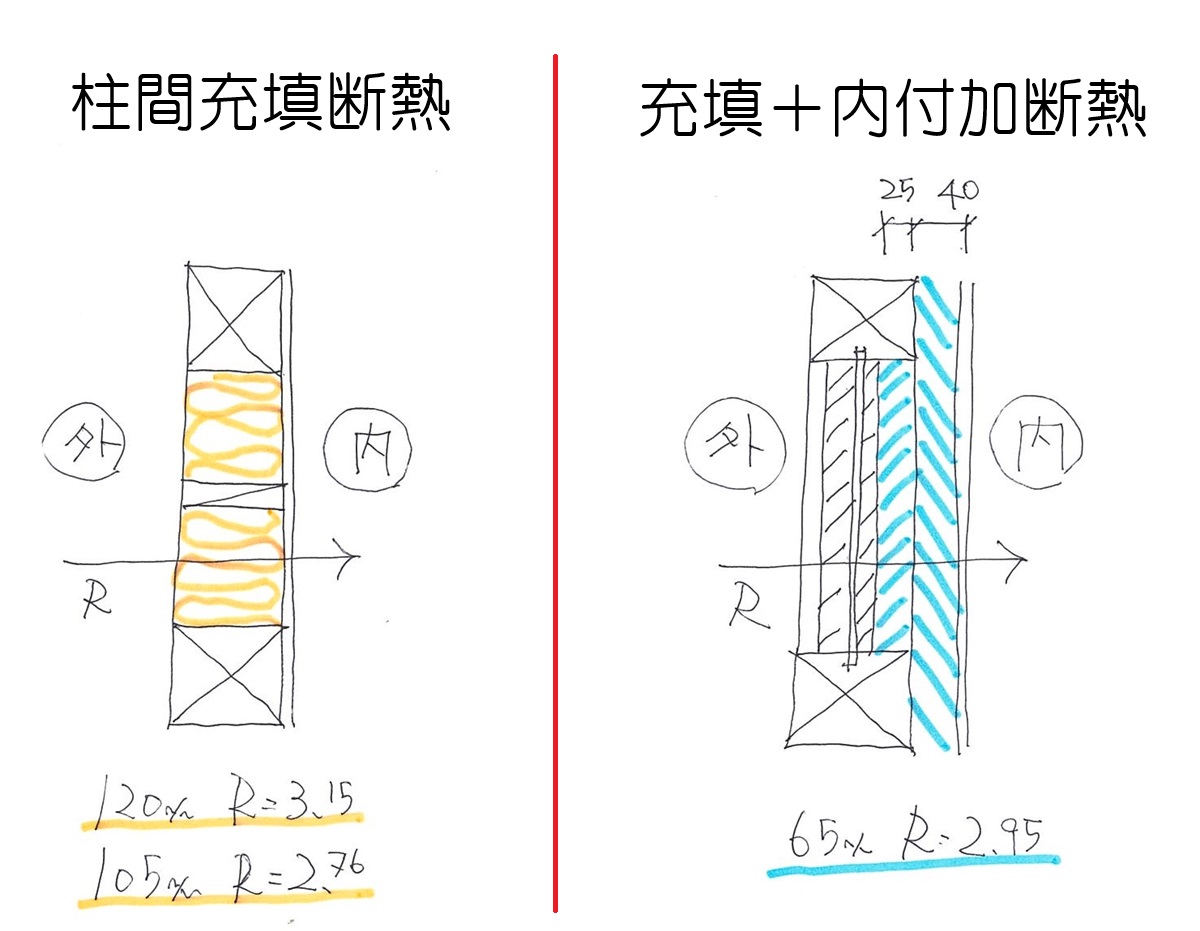 柱のみ残して、断熱材を充填する方法が一般的ですが、例えば下図左の様に真壁を残して充填+室内側に付加断熱をするのも手(クリック可)
