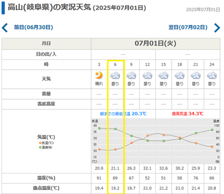 6時台の気温が21.1度で湿度が89%・・気温低いから良いモノの、結構な高湿度です。