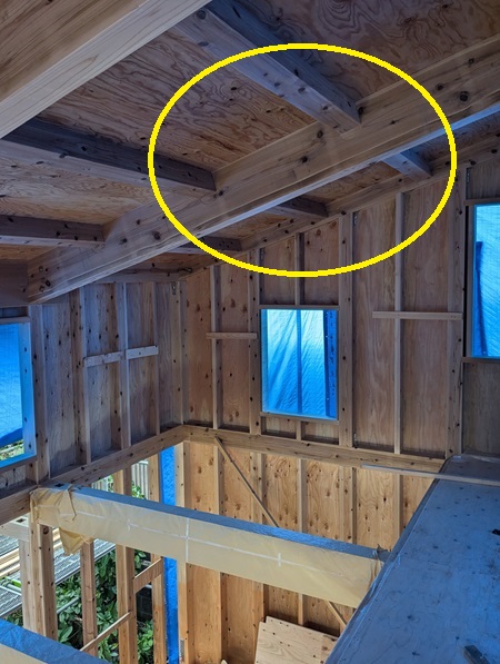 ちなみに その登り梁構造を室内から見るとこんな感じ。
