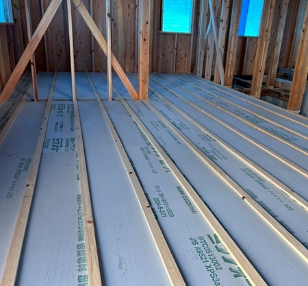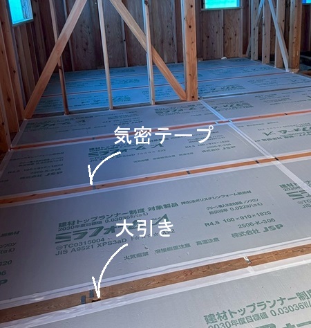 床合板の前に100mm断熱材と木材間を気密処理します。