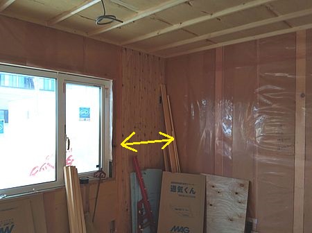 壁の向こうに見えるのは、隣の部屋の天井にある高性能グラスウール(厚み400mm)