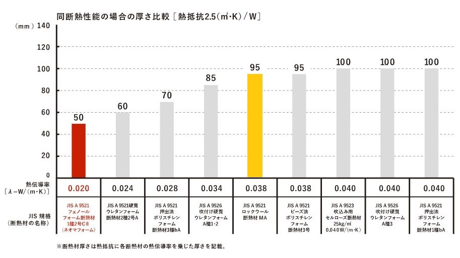 断熱材の一種 いわゆるフェノールフォームですが、熱伝導率が0.020W/m・k(グラフ赤棒)と群を抜いて低いので、うちで標準的に使うHGWの0.038(グラフ黄棒)や他の断熱材よりも優れています!と言う表です。