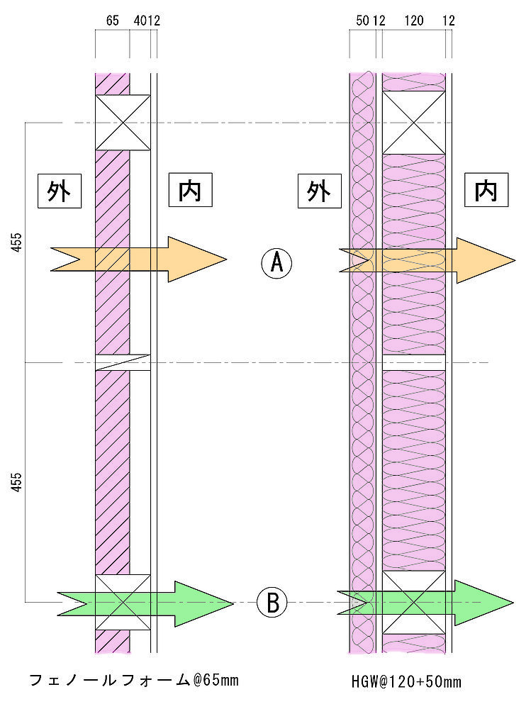 フェノールフォームの壁構成には、40mmほど流動するだろう空気層がありますが、そこは目を瞑るとして(笑