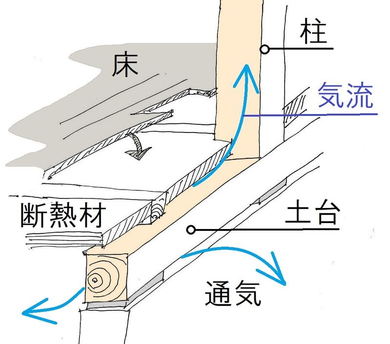 黄色い部分が壁の厚み(断熱材が入る層)ですが、根太と言う床を支える下地が壁内に貫通していますので、そこに十分な隙間が出来て、温度差による「気流」が生れる訳です。