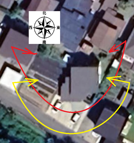 こちら黄色が冬至の頃の日射角度で、赤が夏至の頃の太陽角度。